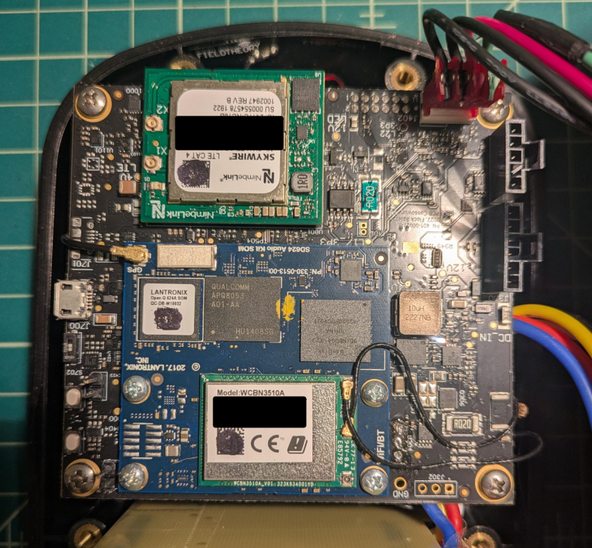 Something we learned from prior research was that the Flock Falcon cameras use a Lantronix SD624A Audio Kit SOM under the hood. This board is connected to custom daughter boards that control the various peripherals on the Falcon device, such as the infrared LEDs, camera, battery, etc. The SOM is the blue PCB in the photo below.