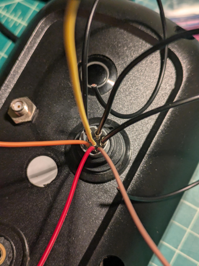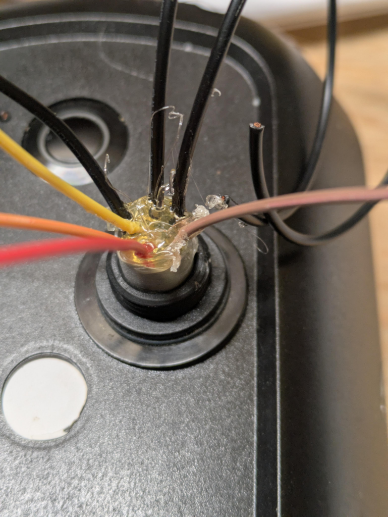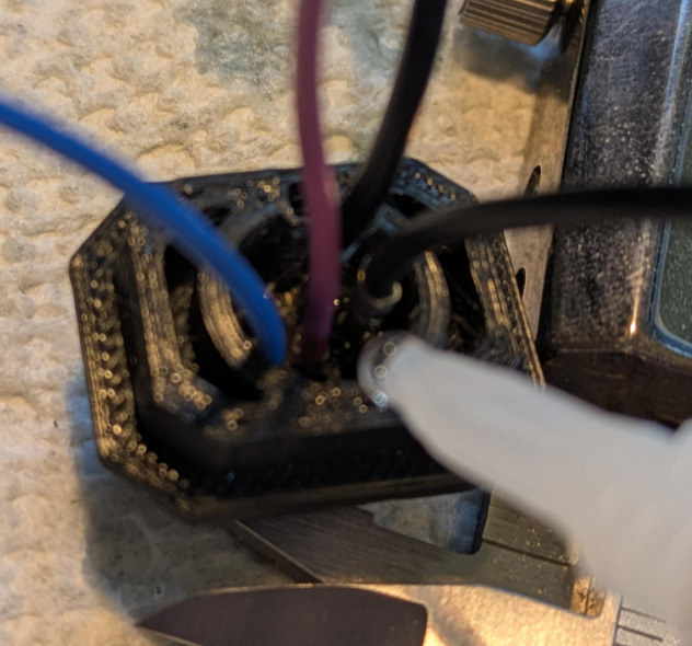 This time we didn't use hot glue, but instead just a bit of super glue. This is likely not as strong, but it was less messy and didn't risk melting the wire insulation.