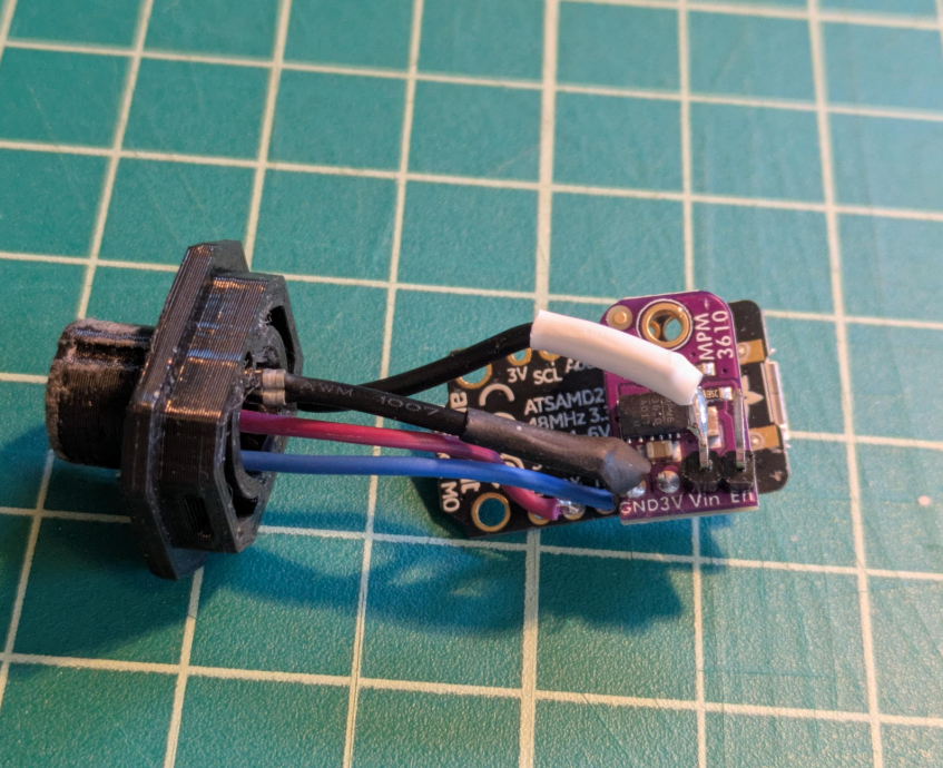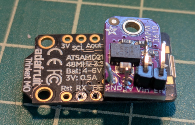 The last thing to figure out was power. The Trinket M0 requires between 3V and 6V input power. It will regulate it down to the required 3V. We didn't want to have to include a battery. Luckily the Flock connector includes ground and 12V pins. We could power the Trinket from this 12V pin, but we'd have to regulate the voltage down to something the Trinket could handle. Adafruit also sells a 3.3V buck converter. This circuit accepts up to 21V and regulates it down to 3.3V. It's also tiny, which was perfect for our application. It cost less than $6 USD at the time of this writing.