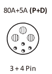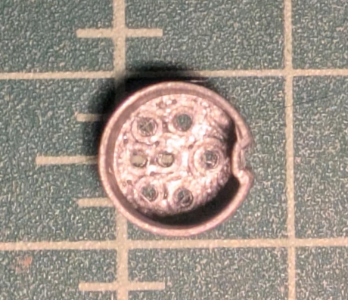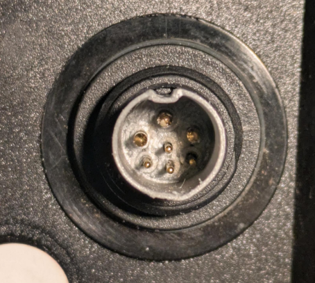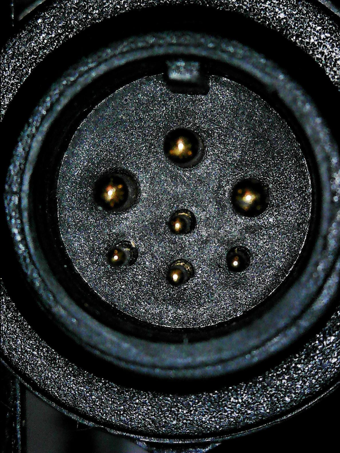 This is a 7-pin connector, though only six of the pins are electrically connected. The three top pins are thicker than the bottom four. We spent a lot of time trying to figure out what exactly this connector is and where we could purchase its mate for experimentation. However, we were never able to find a perfect match. The closest we found was an Amphenol connector on page 42 of this catalog.