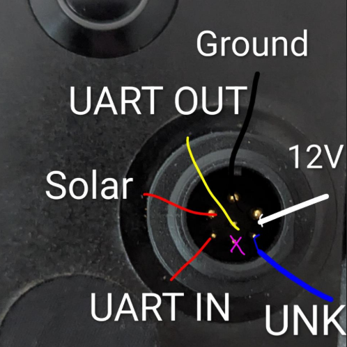 As you can see from the image, the top three pins are for a solar panel, ground, and a 12V line. When the camera is turned on, the 12V pin provides power. One of the bottom pins is not connected. Another one is still unknown to us. But, we were surprised to learn that two of the bottom pins were directly connected to the UART. This means that if you can get physical access to a Flock Falcon camera, you can connect an FTDI to these pins plus the ground pin and get a shell on the device.